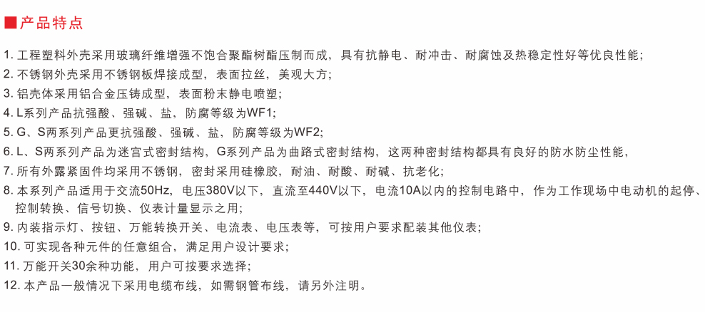 1. 适用于强酸、强碱、盐、氨、氣离子腐蚀、多水、多尘、潮湿的环境;